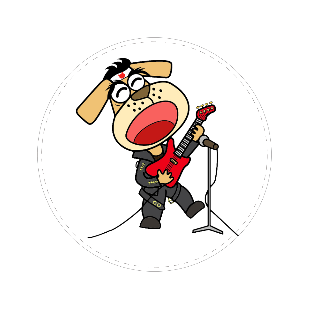 缶バッチ 色:銀 素材:ブリキ 印刷手法:オンデマンド印刷 サイズ:56×56(mm) ラインスタンプでもお馴染みの私のオリジナルキャラクターなめ犬が、エレキギターを弾いています。