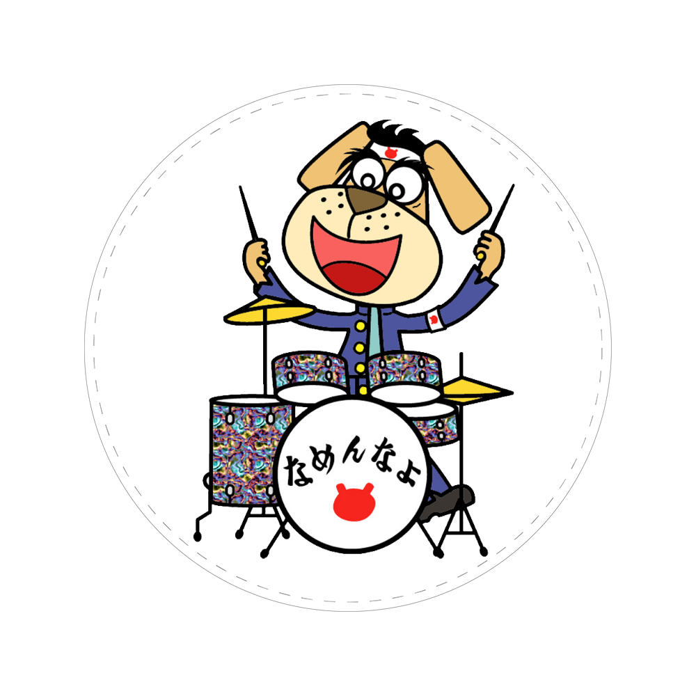 缶バッチ 色:銀 素材:ブリキ 印刷手法:オンデマンド印刷 サイズ:56×56(mm) ラインスタンプでもお馴染みの私のオリジナルキャラクターなめ犬が、ドラムを叩いています。