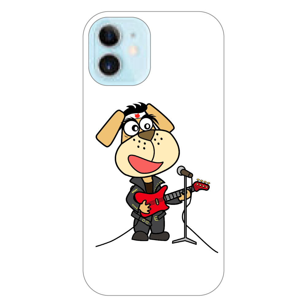 iPhone12mini 色:ホワイト 素材:ポリカーボネート樹脂 印刷手法:UV ラインスタンプでもお馴染みのキャラクター、なめ犬がエレキギターを弾いています。
