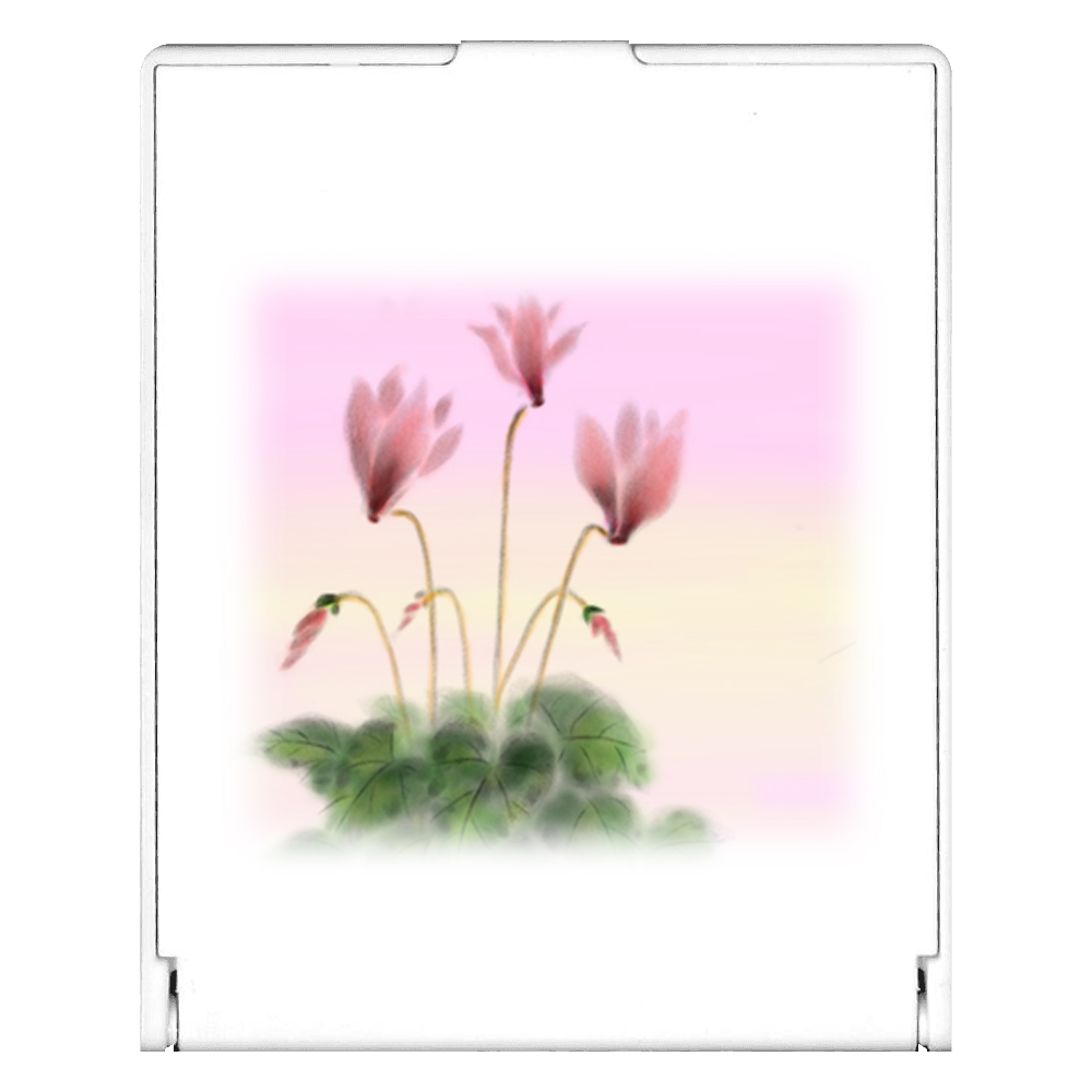 スクエアミラー 色:ホワイト 素材:ポリスチレン/ガラス 印刷手法:UV印刷 サイズ:H115mm×W92mm(折り畳み時) ラインスタンプでもお馴染みのデジタル墨絵のシクラメンです。デジタルペンで描きました。