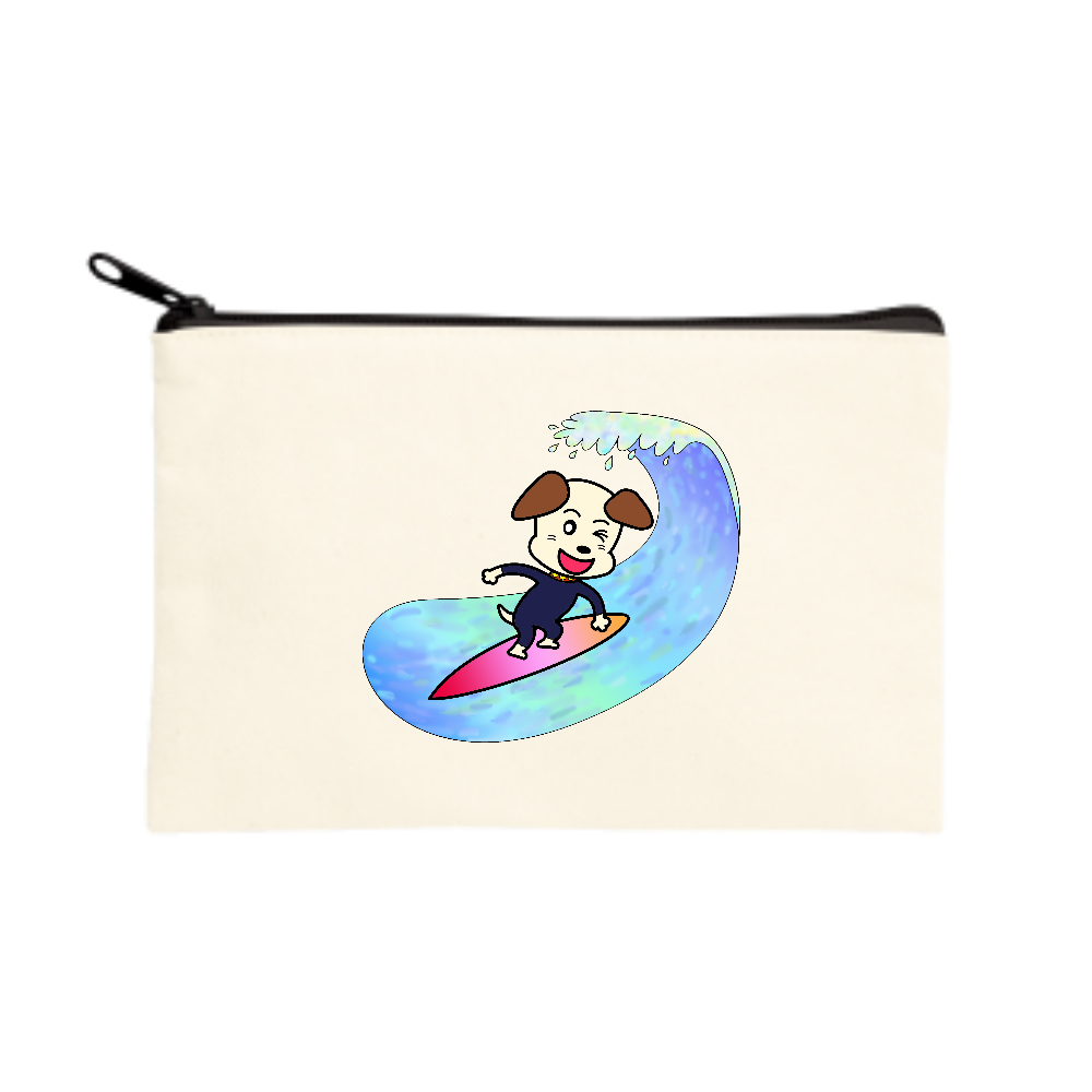 ポーチ(S) 色:ナチュラル 素材:綿100% サイズ:幅200mm・高さ120mm ラインスタンプでもお馴染みの私のオリジナルキャラクターライーンが、サーフィンをしています。
