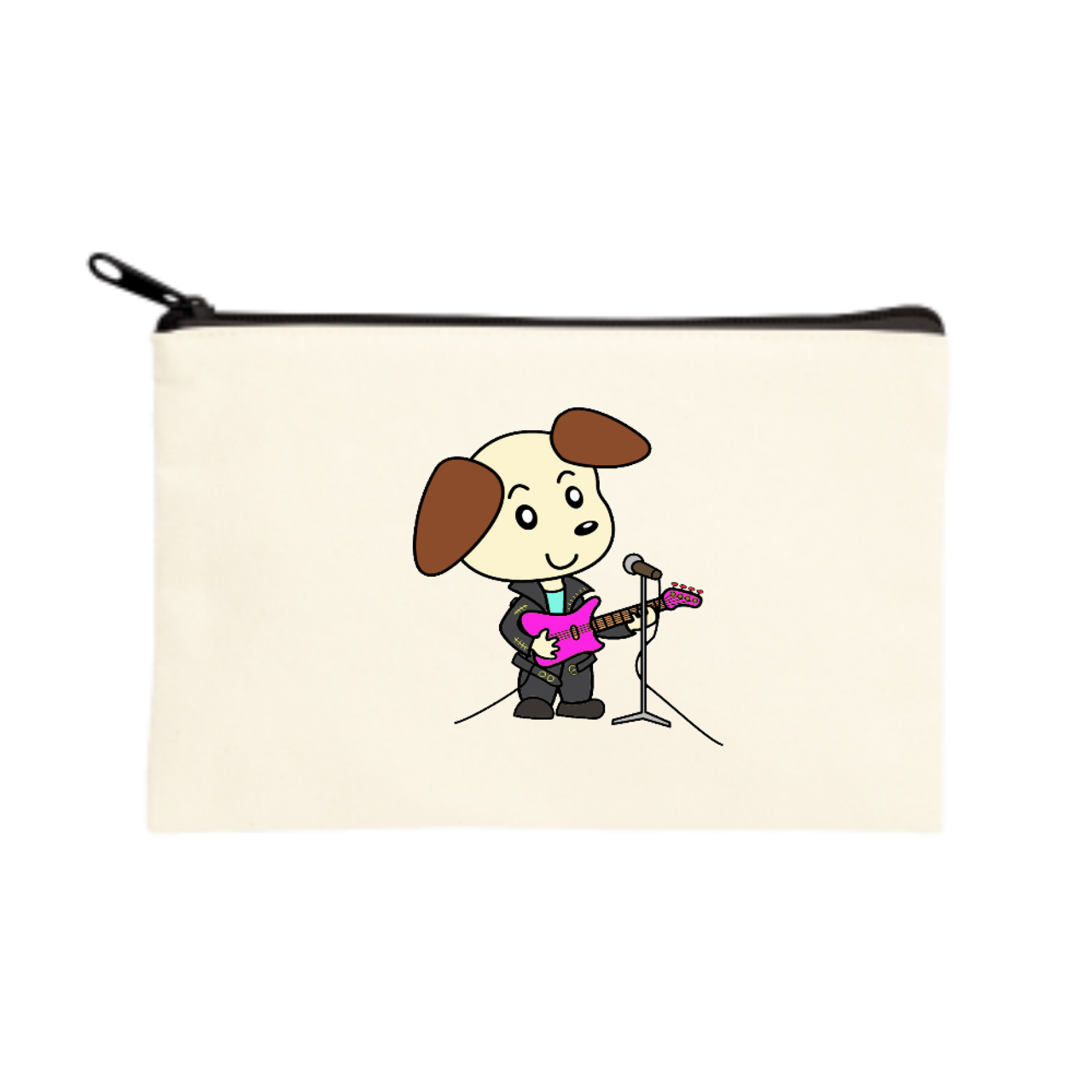 ポーチ(S) 色:ナチュラル 素材:綿100% サイズ:幅200mm・高さ120mm ラインスタンプでもお馴染みの私のオリジナルキャラクターライーンが、エレキギターを弾いています。
